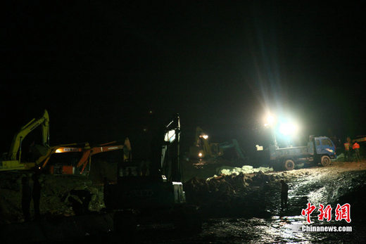8月14日凌晨,汶川境內(nèi)映秀鎮(zhèn)、漩口鎮(zhèn)、銀杏鄉(xiāng)、三江鄉(xiāng)等鄉(xiāng)鎮(zhèn)發(fā)生多處泥石流災(zāi)害,泥石流阻斷道路、沖毀房屋,泥石流沖出物致使120米寬的岷江河道淤塞,堰塞體平均高度達7米,致使岷江改道。圖為工程人員正在連夜處置堰塞體。中新社發(fā) 張浪 攝