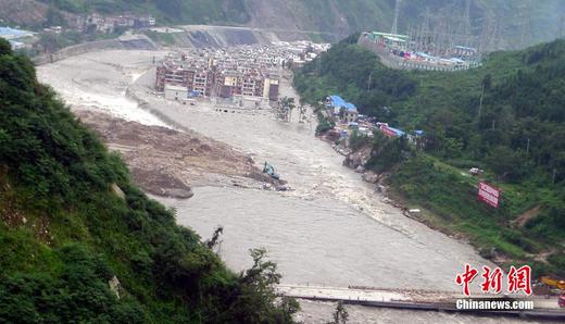 8月13日晚至14日凌晨,汶川縣境內(nèi)突降暴雨,導(dǎo)致映秀、漩口、銀杏等多個(gè)鄉(xiāng)鎮(zhèn)發(fā)生滑坡、泥石流等災(zāi)情,交通、通信、電力、供水中斷,岷江河段形成堰塞湖,將沿江的九寨溝環(huán)線、213國道淹沒,道路中斷。圖為8月15日拍攝的被洪水圍困的映秀新鎮(zhèn)全貌。中新社發(fā) 李杰 攝