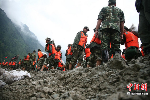 8月19凌晨,汶川縣映秀鎮(zhèn)因暴雨再暴發(fā)泥石流地質(zhì)災(zāi)害,新打通的泄洪槽被堵塞,搶險(xiǎn)形勢(shì)嚴(yán)峻,為確保映秀鎮(zhèn)新城安全,400名武警官兵全力奮戰(zhàn),最終筑起長(zhǎng)260米,寬16米,高3米的“堅(jiān)固長(zhǎng)城”。中新社發(fā) 張浪 攝