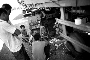 8月23日,京藏高速,被堵在郭磊莊入口的大貨車司機(jī)在車下打牌。王申 攝