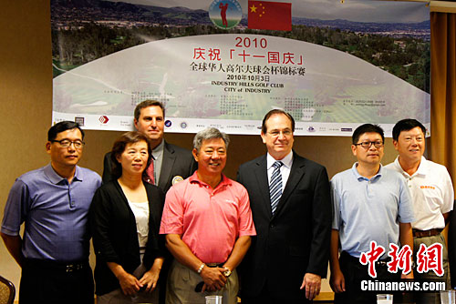 為慶祝中華人民共和國成立61周年,美國環(huán)太平洋商會、南加州華人聯(lián)合總會等團(tuán)體將于10月3日聯(lián)合舉辦“全球華人高爾夫球會杯錦標(biāo)賽”。美國環(huán)太平洋商會會長江啟光(左一)9月11日在記者會上稱,屆時將有來自中國大陸、海外和美國的數(shù)百名選手參賽。張煒 攝