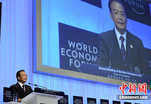 9月13日,世界經(jīng)濟(jì)論壇2010年新領(lǐng)軍者年會(簡稱“夏季達(dá)沃斯論壇”)開幕,國務(wù)院總理溫家寶出席開幕式并致辭。中新社記者 劉震 攝