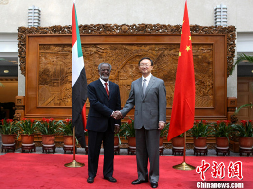 9月14日,中國(guó)外交部長(zhǎng)楊潔篪在北京會(huì)見(jiàn)了應(yīng)邀來(lái)訪的蘇丹外長(zhǎng)庫(kù)爾提。中新社發(fā) 蘇丹 攝