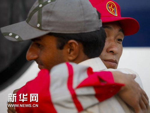 9月14日,在巴基斯坦南部特達(dá)地區(qū),準(zhǔn)備啟程回國的中國國際救援隊第一批隊員在駐地巴基斯坦工作人員相擁道別 周磊攝