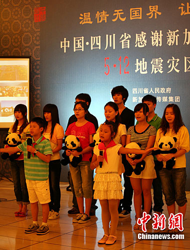圖為來自地震災四川綿竹中新友誼小學的兩位小朋友與新加坡四川籍留學生代表一起在見面會上演唱了《感恩的心》,表達感謝之情。鄒輝 攝