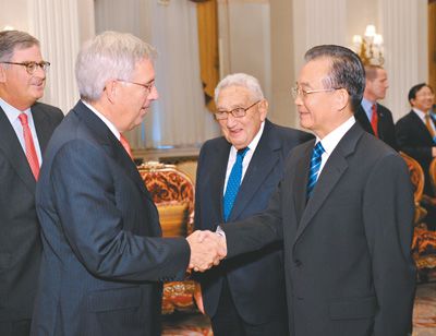 溫家寶指出,中美在政治上合則兩利,斗則俱傷;在經(jīng)濟上,已經(jīng)到了誰也離不開誰的地步。中美之間的共同利益遠遠大于分歧。目前雙邊關(guān)系中面臨的一些矛盾,是發(fā)展中出現(xiàn)的問題,要通過對話合作加以解決。中美要做合作伙伴,而不是競爭對手。一個強大穩(wěn)定的中國對美國和世界有利,中國也希望美國保持強大穩(wěn)定。