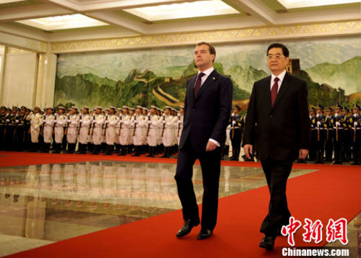 9月27日,中國國家主席胡錦濤在北京人民大會(huì)堂舉行儀式歡迎俄羅斯總統(tǒng)梅德韋杰夫訪華。中新社記者 廖攀 攝