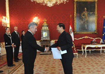 據(jù)外交部網(wǎng)站消息,中國駐奧地利大使史明德27日在維也納總統(tǒng)府向奧聯(lián)邦總統(tǒng)菲舍爾正式遞交國書,并與菲舍爾總統(tǒng)進行交談。會見結(jié)束后,史明德大使檢閱了奧國防軍儀仗隊,軍樂團演奏了中華人民共和國國歌和奧地利聯(lián)邦國歌。