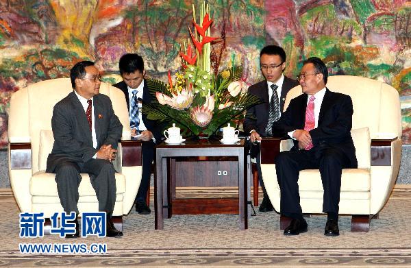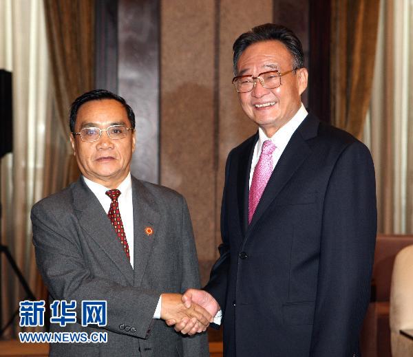 中國全國人大常委會委員長吳邦國2日上午在上海會見來華出席上海世博會的老撾國會主席通辛。
