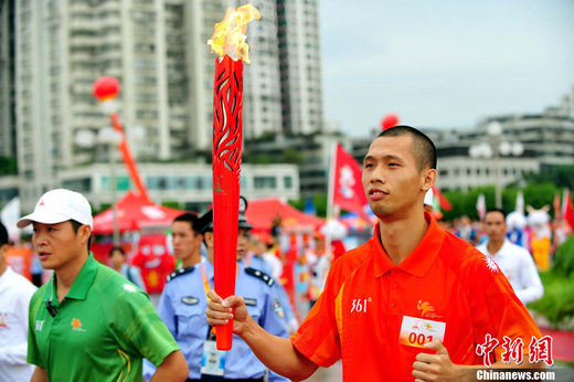 10月21日,亞洲冠軍、中國國家田徑隊現(xiàn)役運動員劉孝生在著名僑鄉(xiāng)汕頭傳遞第16屆亞運火炬。中新社記者 陳文 攝