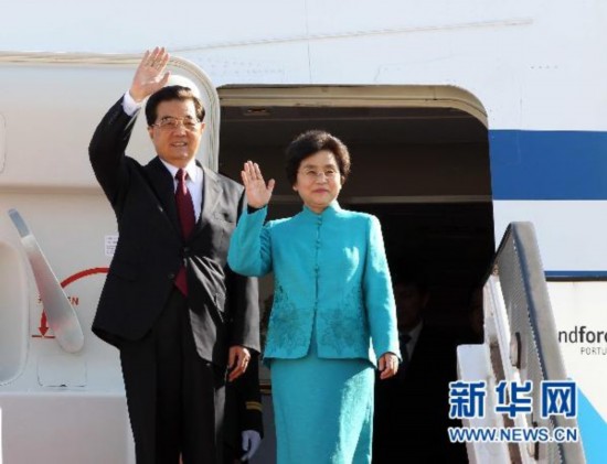 11月6日,中國(guó)國(guó)家主席胡錦濤乘專機(jī)抵達(dá)里斯本,開始對(duì)葡萄牙進(jìn)行國(guó)事訪問(wèn)。這是胡錦濤和夫人劉永清在機(jī)場(chǎng)向歡迎人群招手致意。新華社記者蘭紅光攝