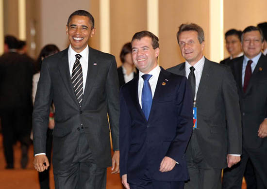11月12日,美國總統(tǒng)奧巴馬(前左)和俄羅斯總統(tǒng)梅德韋杰夫(前右)步入二十國集團首爾峰會全體會議會場。當(dāng)日,二十國集團第五次峰會第一次全會在韓國首爾正式召開,會議將關(guān)注全球經(jīng)濟合作和推動世界經(jīng)濟持續(xù)復(fù)蘇等重大議題。 新華社發(fā)