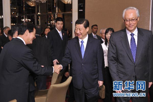 11月15日,中國國家副主席習(xí)近平在新加坡與吳作棟國務(wù)資政共同出席慶祝中新建交20周年招待會(huì)并致辭。這是習(xí)近平與出席招待會(huì)的人士親切握手。新華社記者 黃敬文 攝