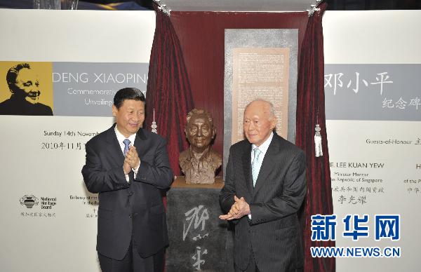 資料圖片:11月14日,正在新加坡訪問的國家副主席習(xí)近平與新加坡內(nèi)閣資政李光耀共同出席在新加坡河畔舉行的鄧小平紀(jì)念碑揭幕儀式。新華社記者黃敬文攝