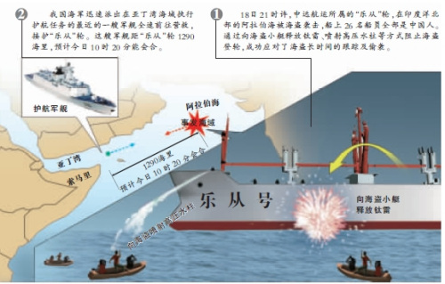 18日21時(shí)45分,我國(guó)海軍迅速派出在亞丁灣海域執(zhí)行護(hù)航任務(wù)的最近的一艘軍艦全速前往營(yíng)救,接護(hù)“樂(lè)從”輪。這艘軍艦距“樂(lè)從”輪1290海里,預(yù)計(jì)20日10時(shí)20分能會(huì)合。