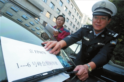 2006年10月31日,為保障中非論壇交通秩序,北京朝陽交通支隊民警來到區(qū)政府協(xié)助保衛(wèi)部門將公車封存停駛。
