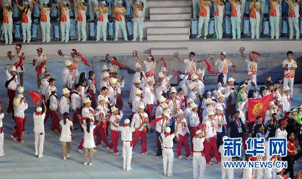 各代表團在閉幕式上入場 11月27日,吉爾吉斯斯坦代表團在閉幕式上入場。當(dāng)日,第16屆亞運會閉幕式在廣州市海心沙島舉行。 新華社記者楊磊攝