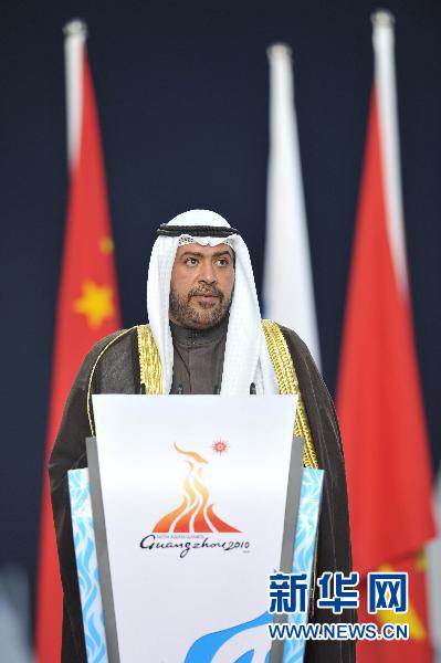 11月27日,亞奧理事會(huì)主席艾哈邁德·法赫德·薩巴赫親王在閉幕式上致辭。當(dāng)日,第16屆亞運(yùn)會(huì)在廣州市海心沙島舉行閉幕式。新華社記者公磊攝