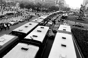 2010年7月21日下午,中關(guān)村海淀黃莊路口北,進站的公交車排起長隊,好像一列“公交列車”。李飛 攝