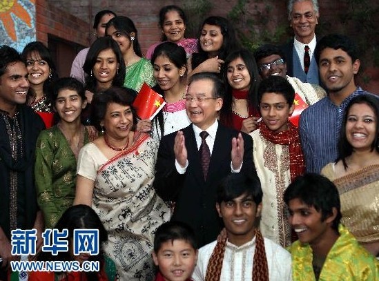 在中印商務合作峰會發(fā)表演講后,16時30分許,溫家寶總理來到了泰戈爾國際學校。校園里,許多學生身著民族服裝,揮舞著中印兩國國旗,用漢語歡迎溫總理的到來。