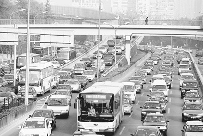 北京市國(guó)貿(mào)橋路段,早高峰時(shí)道路擁堵,車輛行駛緩慢。