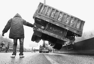 5日,一輛貨車因道路結冰而失控沖下貴新高速公路。工作人員利用吊車施救。吳東俊攝(人民圖片)