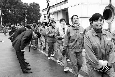 今年1月3日,浙江省臺州市一家企業(yè)新年第一個工作日,董事長攜公司中高層領(lǐng)導在大門口鞠躬迎接員工上班。孫金標攝(資料圖片)
