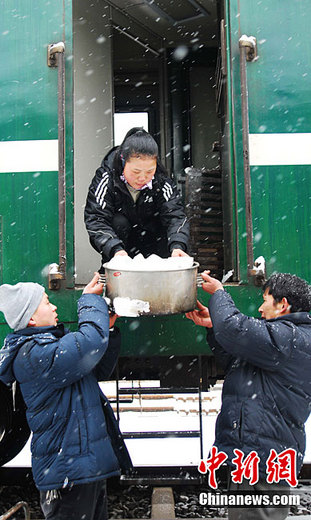 1月18日,一場大雪突降江西九江等地,江西贛北地區(qū)大雪紛飛,一片銀白,江西境內的鐵路部門做好車輛防斷檢修和餐車食品供應工作,確保人們出行安全暢通。圖為工作人員正在風雪中往客車上運送餐料食品。胡國林 攝