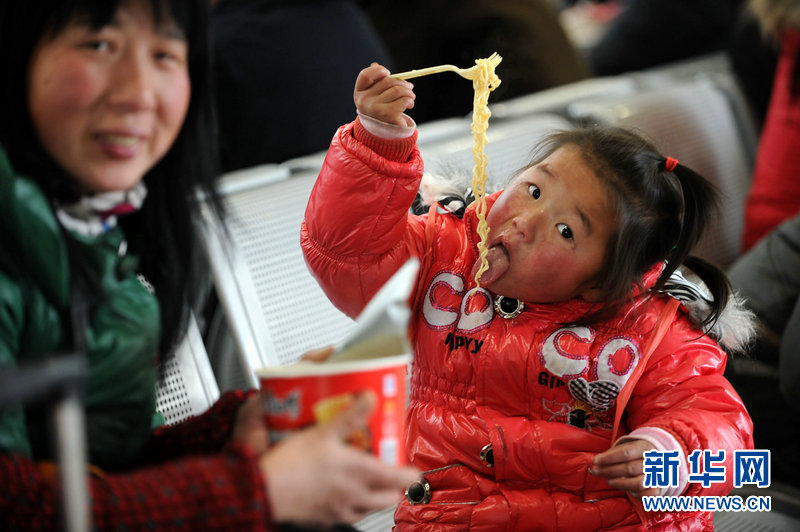 1月19日,與媽媽一同前往深圳過年的余明麗小朋友在合肥火車站候車室吃方便面。當(dāng)日,2011年鐵路春運(yùn)正式啟動。2011年鐵路春運(yùn)自2011年1月19日起至2月27日止,為期40天。春運(yùn)期間,全國鐵路預(yù)計(jì)發(fā)送旅客2.3億人次,同比增加2554萬人次,增長12.5%,日均575萬人次。其中,發(fā)送直通旅客9200萬人次,同比增長11.6%。新華社記者李健攝