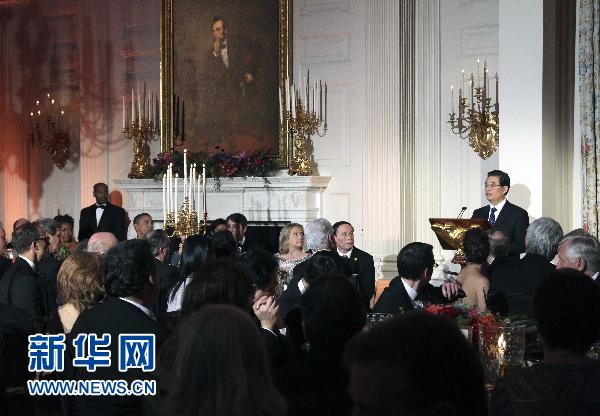 中國(guó)國(guó)家主席胡錦濤19日晚出席美國(guó)總統(tǒng)奧巴馬在白宮為他到訪舉行的歡迎宴會(huì)。
