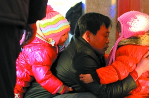 20日,一位乘客在北京站送妻子和女兒去錦州過(guò)新年,在車站他抱著孩子依依不舍。本報(bào)記者 周曉東 攝