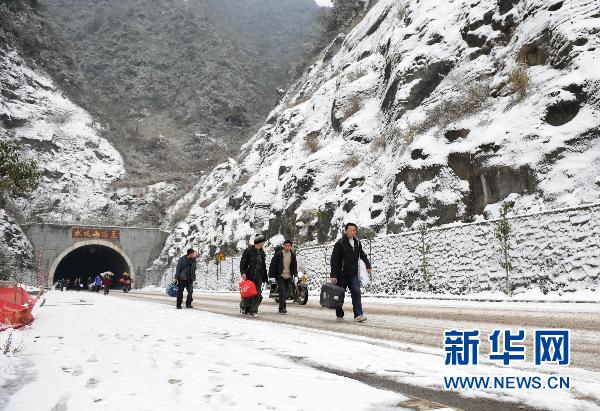 資料圖片:1月19日,返鄉(xiāng)民工帶著行李在319國道上徒步行走。當(dāng)日是全國春運(yùn)首日,渝東南地區(qū)受到嚴(yán)重的冰雪天氣影響,部分客運(yùn)車輛停運(yùn)。新華社記者 陳誠 攝