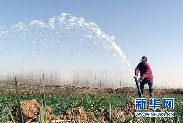 山東滕州市級索鎮(zhèn)千佛閣村村民王次玉在給麥田灌溉。據(jù)山東省防汛抗旱指揮部辦公室22日通報,全省旱情仍在持續(xù)加劇,總體已達(dá)60年一遇標(biāo)準(zhǔn),抗旱形勢日趨嚴(yán)峻,人畜臨時飲水出現(xiàn)困難。新華社記者范長國攝