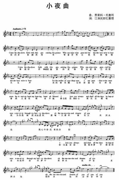 去年夏天的一天,我接到江澤民同志的電話,他問我有沒有托塞利《小夜曲》的英文歌詞,當(dāng)時我手頭沒有,答應(yīng)幫助找一下。我通過國內(nèi)外各種渠道進(jìn)行了認(rèn)真的查找,找到兩個版本的英文歌詞,但都不是當(dāng)年在國內(nèi)流行的那個版本。江澤民同志也親自請幾位老音樂家?guī)椭鷮ふ遥瑯記]有結(jié)果。