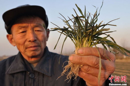 1月24日,山東鄒平縣好生鎮(zhèn)蒙二村村民在查看干旱的麥苗。據(jù)山東省防汛抗旱指揮部辦公室近日通報,全省旱情仍在持續(xù)加劇,總體已達(dá)60年一遇標(biāo)準(zhǔn),抗旱形勢日趨嚴(yán)峻。 董乃德 攝