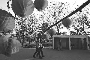 游人走過點綴著大紅燈籠的陶然亭公園。昨日廠甸廟會緊張籌備。本報記者 吳江 攝