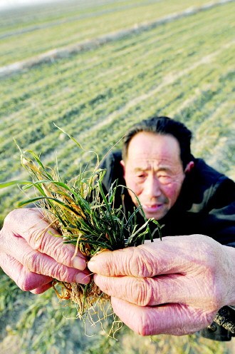 山東旱情60年一遇,上圖為山東鄒平縣臺(tái)子鎮(zhèn)位家村村民在查看干旱的麥苗。董乃德攝