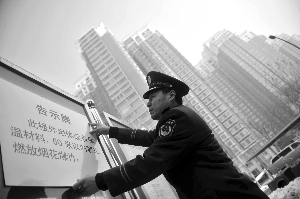 昨日上午,消防人員在怡;▓@高樓旁立告示牌。本報記者 李強 攝