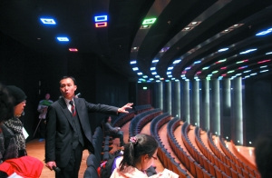 昨日,國家博物館新館內,一名工作人員在介紹國博影院。