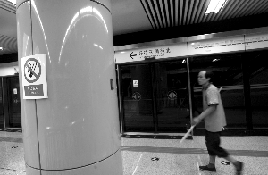 2007年9月16日,地鐵東單站站臺立柱上貼著禁止吸煙的標志。本報資料圖片 薛珺 攝