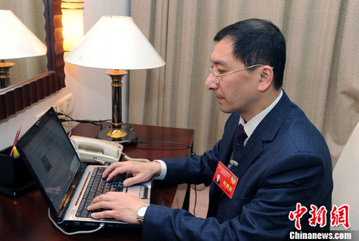 1月11日,福建省政協(xié)委員侯建明利用參會間隙在駐地賓館房間,通過上網用微博與民眾就普遍關心的熱點民生等問題進行互動交流。當日,福建省政協(xié)十屆四次會議在福州開幕。(圖為資料圖)中新社記者 劉可耕 攝