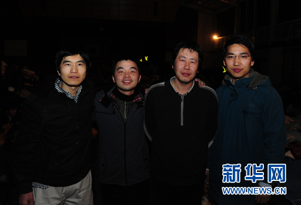 這是在仙臺市立三條中學校安置點拍攝的日本東北大學中國留學生常海欣、昂然、王麟和金頂峰(左至右)(3月12日攝)。新華社記者 季春鵬 攝