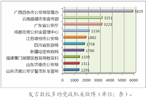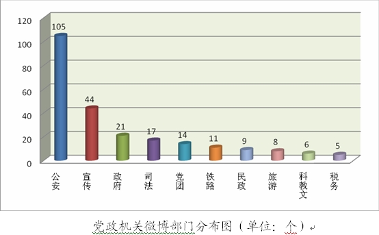 在黨政部門分布上,公安系統(tǒng)可謂一枝獨秀。早在2010年2月,廣東省公安系統(tǒng)便率先開設(shè)我國首批公安微博群。此后3個月內(nèi),廣東公安微博共發(fā)布信息近萬條,粉絲總數(shù)逾10萬人,評論總數(shù)超過3萬條。目前騰訊的廣東公安微博粉絲突破300萬,是中國目前粉絲數(shù)最多的政府網(wǎng)站。2010年7月,北京市公安局公共關(guān)系領(lǐng)導(dǎo)小組成立,北京市公安局長傅政華擔任領(lǐng)導(dǎo)小組組長。8月1日,“平安北京”黨政機構(gòu)和官員微博在新浪網(wǎng)開通,20天訪問量即突破210萬人次。此后,全國各省市縣各級公安微博群相繼在人民微博、新浪微博、騰訊微博等平臺出現(xiàn)。據(jù)2011年1月30日公安部官方網(wǎng)站發(fā)布的準確數(shù)字,全國的公安微博已有800余家。公安微博不僅數(shù)量眾多,很多公安微博的總發(fā)言數(shù)也都居于前列。公安微博不僅在信息發(fā)布、警情通報、安全常識推廣等常規(guī)工作領(lǐng)域中服務(wù)于群眾,更多次在突發(fā)事件中大顯身手。黨政宣傳部門居于行業(yè)分布的次席,宣傳部門本身就承擔著信息發(fā)布與媒體管理的職能,微博客已經(jīng)成為宣傳部門在傳統(tǒng)信息發(fā)布渠道之外的有益補充,有利于營造地方黨政良好形象和公信力。
