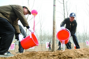 昨天9時(shí),部長(zhǎng)們陸陸續(xù)續(xù)來到濱河公園,他們一下車,便直奔植樹地點(diǎn),揮鍬鏟土,扶苗澆水,短短半天時(shí)間,就栽下了2800多株油松、銀杏、白蠟、千頭椿等樹木。