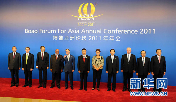 4月15日,中國(guó)國(guó)家主席胡錦濤與出席博鰲亞洲論壇2011年年會(huì)政要合影。 新華社記者 李濤 攝