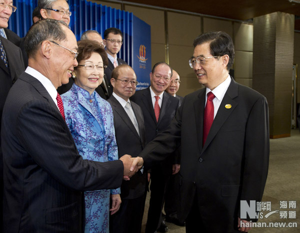 4月15日,中國(guó)國(guó)家主席胡錦濤在海南博鰲國(guó)際會(huì)議中心會(huì)見(jiàn)出席博鰲亞洲論壇2011年年會(huì)的臺(tái)灣企業(yè)家代表并合影。