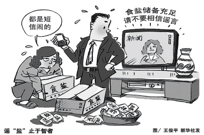 “日本福島第一核電站出現(xiàn)問(wèn)題后,大家都挺緊張,擔(dān)心核污染會(huì)通過(guò)空氣和海水?dāng)U散到中國(guó),污染土壤和未來(lái)的食品來(lái)源,最怕的就是沒(méi)有鹽吃;仡^想想這挺荒唐的,其實(shí)全國(guó)食鹽儲(chǔ)備非常充足,鹽業(yè)公司一般都會(huì)有3個(gè)月的庫(kù)存量,食鹽供應(yīng)完全有保障,而且我們食用的九成是井礦鹽。”作為搶鹽族的一員,市民李先生后悔不已,他還細(xì)數(shù)見(jiàn)證和經(jīng)歷過(guò)的災(zāi)難謠言:2003年非典時(shí)期,公眾聽(tīng)信謠言大量搶購(gòu)板藍(lán)根、中藥和白醋;2008年汶川大地震導(dǎo)致飲用水污染;近期“‘超級(jí)月亮’即將引發(fā)超級(jí)災(zāi)難”等。