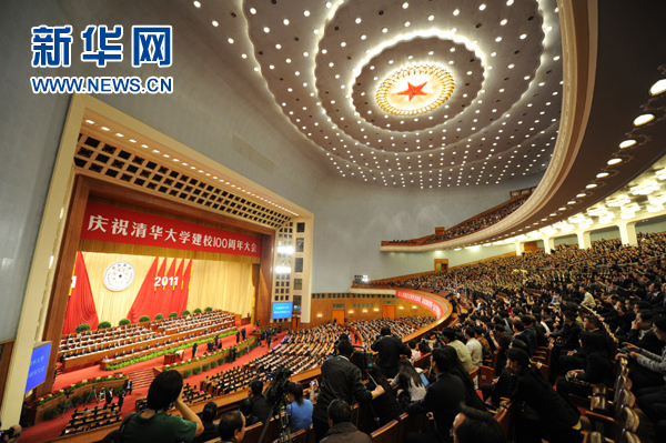 慶祝清華大學建校100周年大會在北京人民大會堂舉行,黨和國家領(lǐng)導人胡錦濤、吳邦國、溫家寶、賈慶林、習近平、李克強等出席大會。