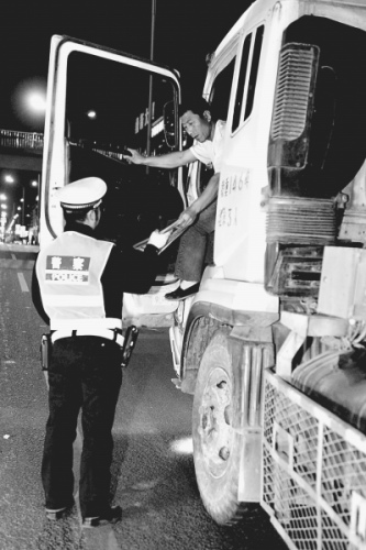 5月2日晚,北京交警在廣渠門橋?qū)^往車輛進(jìn)行例行檢查。記者 楊慧峰攝