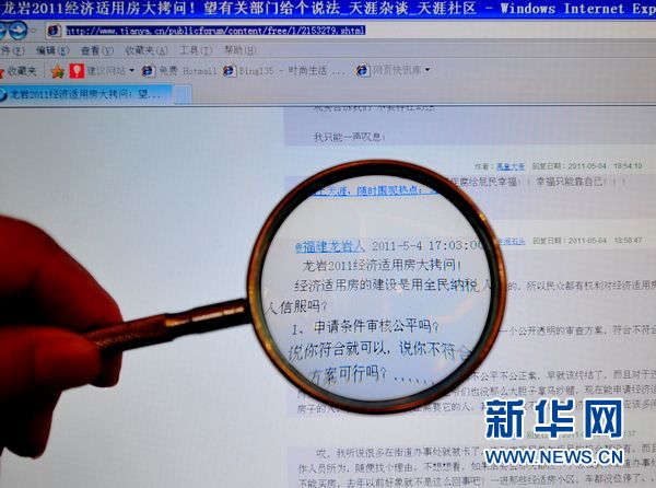2011年5月9日 網(wǎng)曝福建龍巖經(jīng)濟適用房被公職人員“團購” 記者調(diào)查發(fā)現(xiàn)當?shù)亟?jīng)濟適用房亂象叢生網(wǎng)上“龍巖2011年經(jīng)濟適用房大拷問”的帖文引起網(wǎng)民廣泛關注(5月9日攝)。近日,網(wǎng)民“福建龍巖人”在天涯、大旗等多家網(wǎng)絡論壇發(fā)表《龍巖2011經(jīng)濟適用房大拷問!望有關部門給個說法》一帖,質(zhì)疑福建龍巖經(jīng)濟適用房被某些公職人員“團購”。新華社“中國網(wǎng)事”記者9日趕赴福建龍巖對此事進行調(diào)查核實發(fā)現(xiàn),福建龍巖確有不少經(jīng)濟適用房被公職人員購買,更令人不安的是當?shù)亟?jīng)濟適用房亂象叢生,違規(guī)出租、出售經(jīng)濟適用房現(xiàn)象不少。新華社記者 魏培全 攝